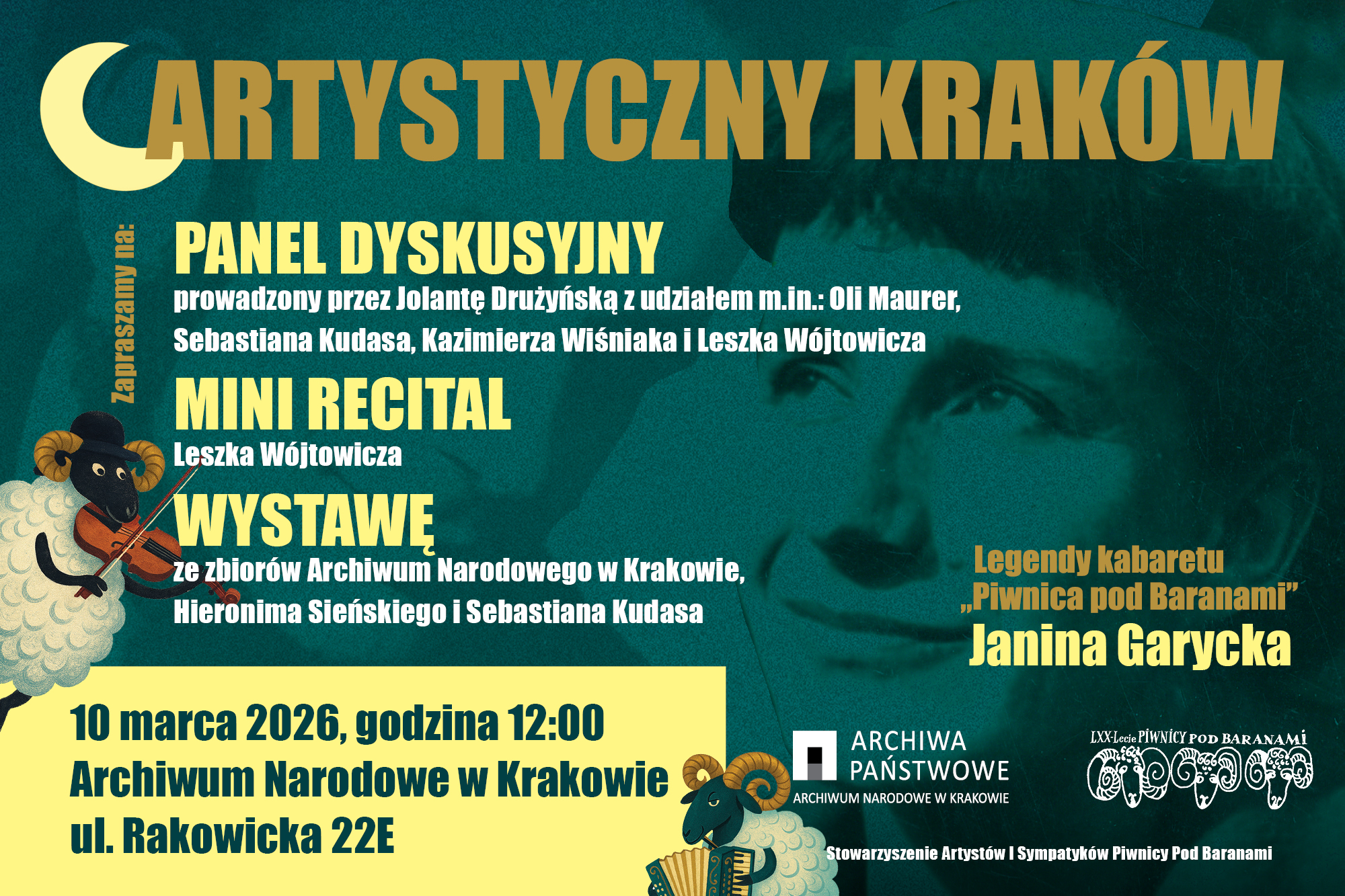 Archiwum Narodowe w Krakowie oraz Stowarzyszenie Artystów I Sympatyków Piwnicy Pod Baranami ma zaszczyt zaprosić na spotkanie poświęcone jednej z kluczowych postaci środowiska legendarnego Kabaretu „Piwnica pod Baranami” – Janinie Garyckiej (1920‒1997) malarce i scenografce, historyczce literatury oraz współzałożycielce Kabaretu. To właśnie jej mieszkanie przy placu Na Groblach stało się na dziesięciolecia miejscem spotkań krakowskiej bohemy artystycznej.